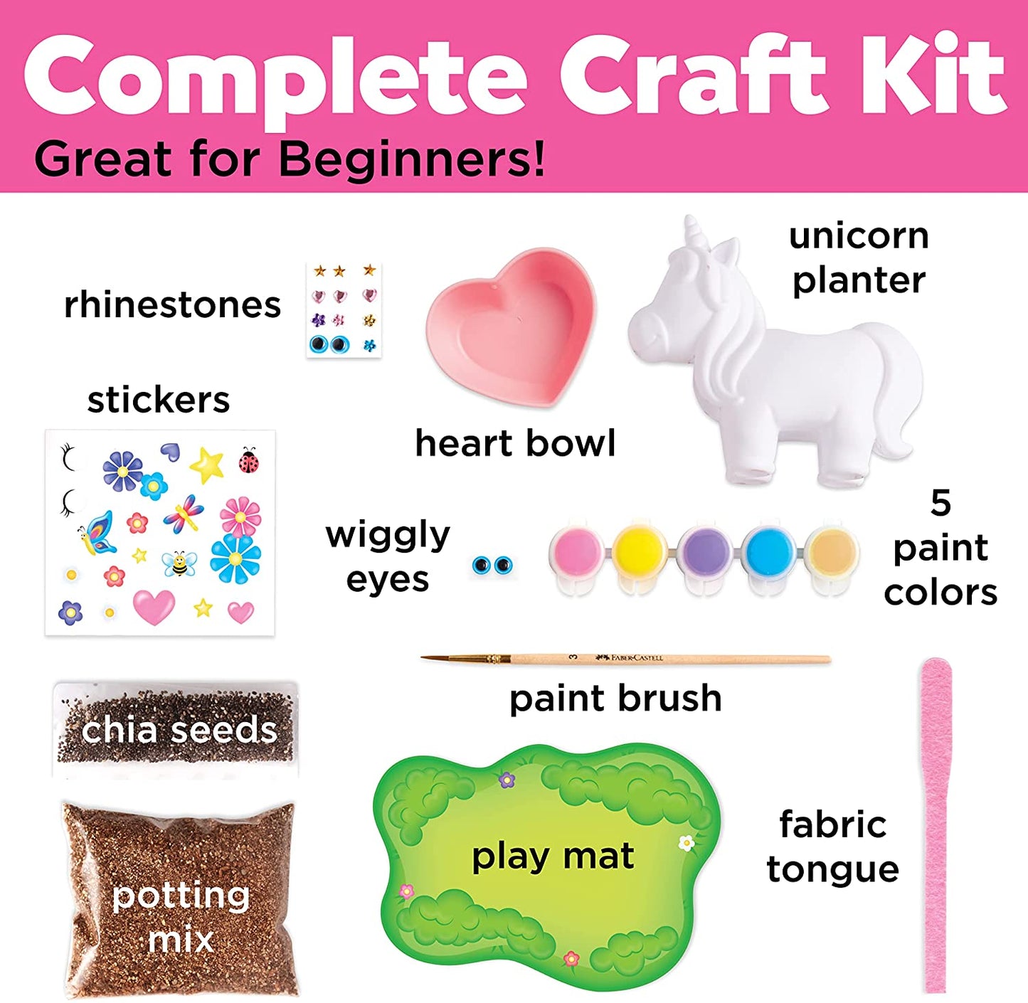 Spark curiosity and inspire creativity with a unique gift for kids. Everything you need to grow a unicorn garden is included, just add water! Complete craft kit for kids includes unicorn planter, rhinestones, wiggly eyes, paint, chia seeds and more!